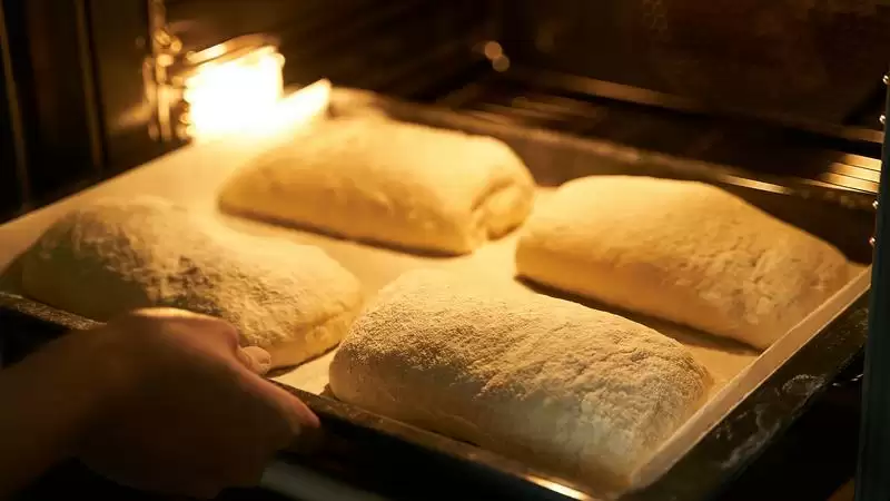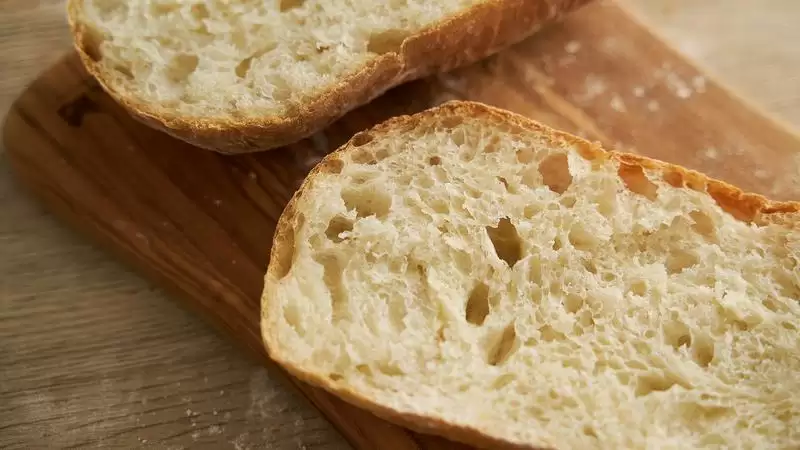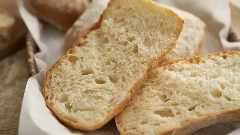高含水量的面团,经过高温烘烤,大量水蒸气迅速散发后,面包自然就能轻松长高,并且切面能看到大而不规则的气孔。