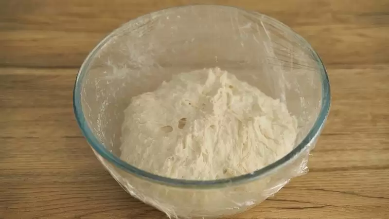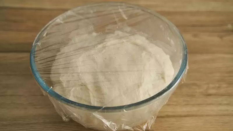 倒入面粉和盐,完全不用揉,只要搅拌至没有干粉的状态,即可包上保鲜膜,室温下饧面70-90分钟;