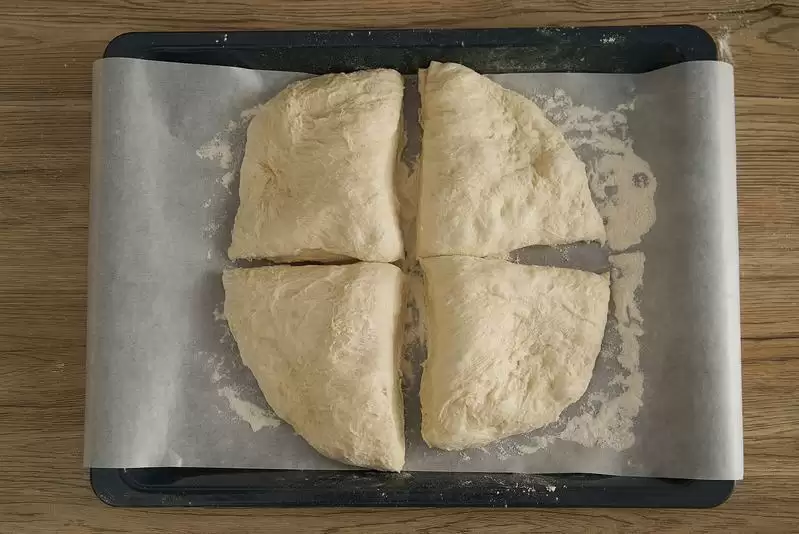 将饧发好的面团转移在撒了面粉的烘焙纸上,面团用刮板或者刀切成4份;