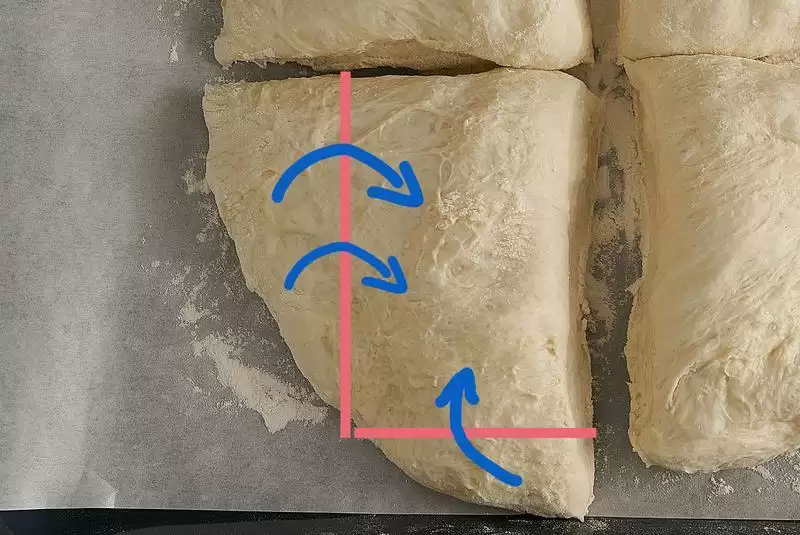 切出来的小面团是四个直角扇形的形状,按照图中蓝色箭头的方向,轻轻地折成大致呈长方形的样子,