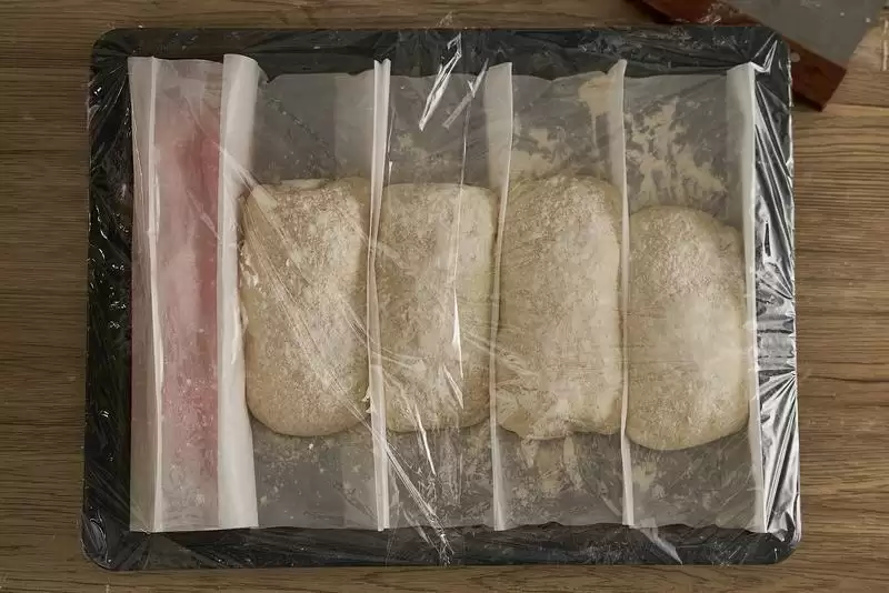 用烘焙纸折出4个宽度接近面团的槽,放上面团包好保鲜膜,最后饧一次面,大概30分钟,烤箱预热220℃热风;