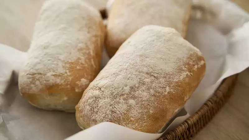夏巴特面包也叫拖鞋面包,因为意大利人一般会横着切开面包,看起来就像一双扁扁的拖鞋~刚烤好的夏巴特外壳是经典欧式面包的酥脆,散发着小麦烘烤之后的焦香,而内部是湿软有弹性的。