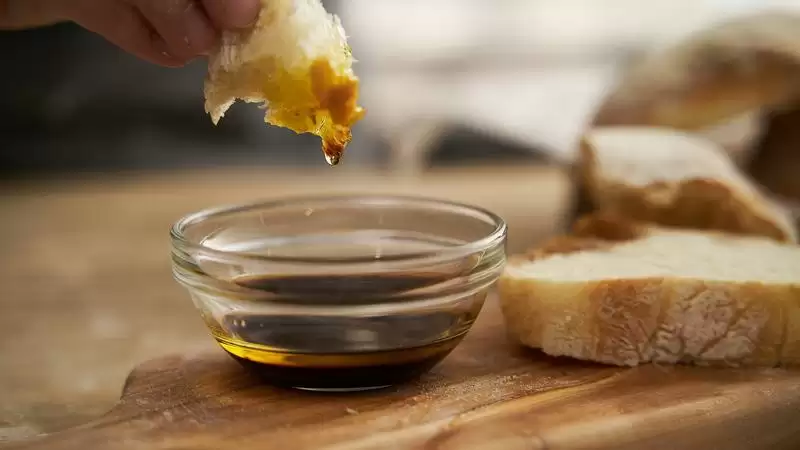 除了直接吃,抹果酱吃,意大利人还会用夏巴特面包蘸油醋汁吃,意大利黑醋的酸味和橄榄油的清爽香气,让面包的麦香更加突出。