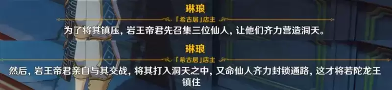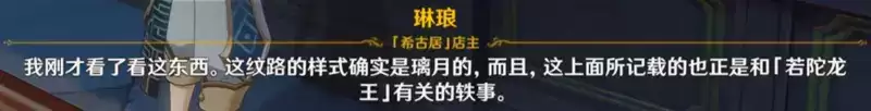 在交付任务道具的时候,古玩店的琳琅会讲述它背后的传说,同时也是今天的主角——若陀龙王。