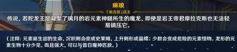 按照她的说法,若陀龙王是诞生自岩元素神髓的魔龙,和蒙德的特瓦林属于同类。根据《林间风·故事拔萃节选》的记载:龙是元素生物的最高级形态之一,罕见而强大,有着魔神匹敌的力量,所以即使是摩拉克斯也无法轻易镇压。