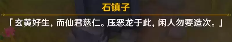 【Part 2 伏龙古树】巨树附近有一块石镇子,上面简单描述了这里发生的事情:为了让人民安居乐业,仁慈的岩王帝君在这里镇压了一头恶龙,立下石碑警示闲杂人等不要捣乱。