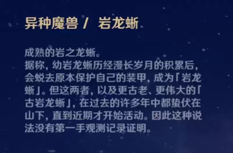 故事中还提到了岩之龙蜥,也就是幼岩龙蜥/岩龙蜥/古岩龙蜥这三种怪物,生物志的描述中明确指出它们之间存在阶段性成长的关系。