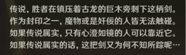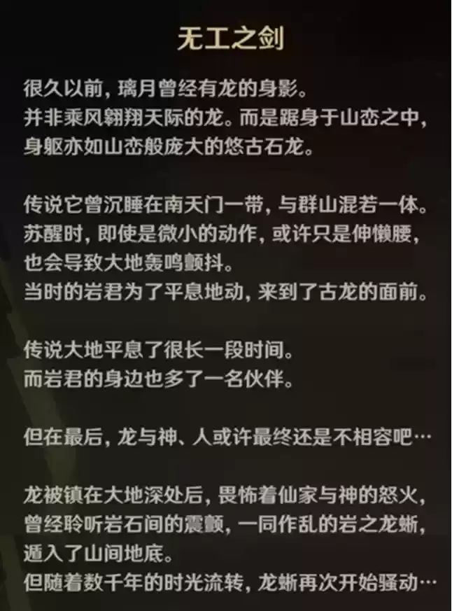 无工之剑的背景故事则提供了更完整的信息:被封印的是原本沉睡在南天门的远古岩龙,有着像山一样庞大的身躯,所以常常引发地震。后来被岩王帝君纳入麾下共同治理人民,但最终还是由于不明原因反目成仇,被封印在大地深处。