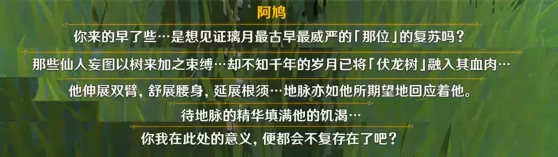 树下还有一位让人在意的的谜语人NPC阿鸠。根据她的说法,这棵树名叫伏龙树,由数千年前的一批仙人创造。但在漫长的岁月中居然被同化成岩龙的一部分,反过来帮助其摄取地脉精华,枝头上的蓝色结晶就是其证明。