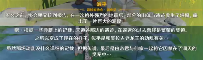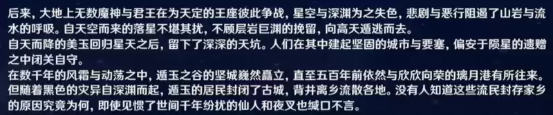 【Part 4 层岩异变】上文中介绍的信息大多来自古老的石碑和书籍,而千年过后的璃月港早已没有龙王的踪迹。但在表面的和平之下,和龙王有关的异变却越来越多。