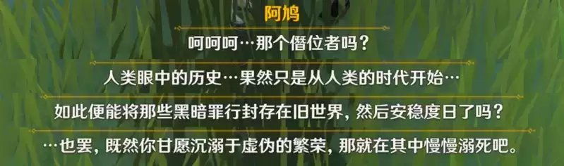 如果选择另一个对话选项,阿鸠会提到一些关于岩王帝君的事情:她将帝君称作僭位者,并且暗示璃月曾经存在不由人类主导的旧时代,人类通过某种黑暗罪行将岩龙与旧世界一同封印,随后才建立了新生活。