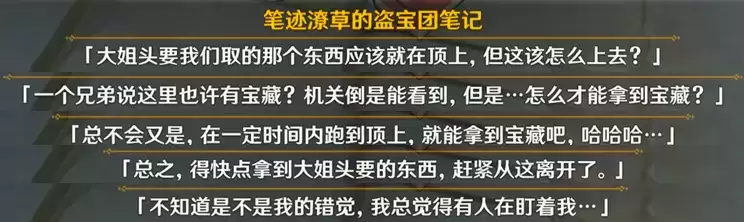 如果要将它们连接起来,就得去中间的天遒谷寻找线索。这里最显眼的就是三座巨大的塔楼,并且每个塔楼的入口都有一本盗宝团留下的笔记。