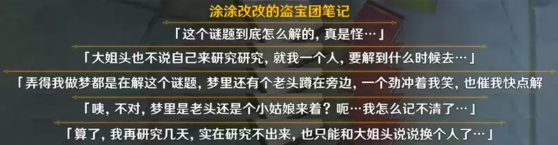 这一症状似乎和1.1版本活动的熄星有点相似,但层岩巨渊的天星早已离开;反而是天遒谷的三本笔记都与精神异常有关,从入侵梦境到产生幻觉,最终结果很可能就是彻底失去意识。