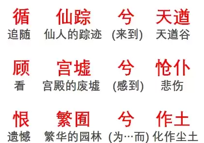 第一、二、四句都很好解释:追随仙家的踪迹来到天遒谷,看着宫殿的废墟而感到悲伤,为繁茂的园林化作尘土而遗憾。