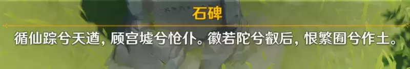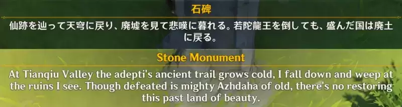 而且照这个思路,立下这座石碑的人很可能是若陀龙王的追随者,就像钟离传说任务中出现的盐神信徒宛烟一样。他们对旧主的信仰无比坚定,即使千年的岁月也无法动摇,也难怪阿鸠会称岩王帝君为“僭位者”。