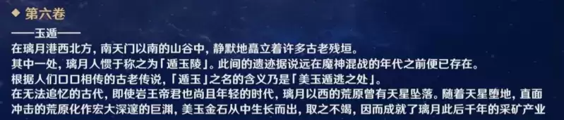 根据《绝云记闻·遁玉》的记载,层岩巨渊所在的区域原本是一片荒原,被从天而降的星辰砸成了现在的巨渊,也带来了数不胜数的美玉金石,支撑着璃月矿产业的发展。