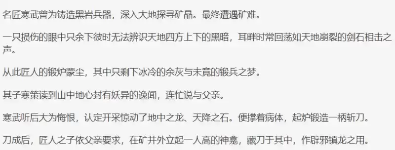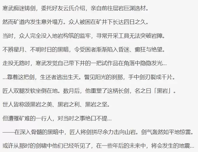 黑岩长剑的背景故事更加详细的讲述了名匠寒武的经历:他曾亲自前往层岩巨渊选材,却被塌方困在矿井之下。在生死存亡之际用手边的试作品开辟了一条生路,同时也预见到了未来将会发生的地震。