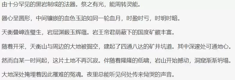 根据黑岩绯玉的背景故事,对天衡山的开采似乎引发了地震,不少矿洞因此坍塌,很多工人死于矿难。后来轻策庄的方士向当时主掌锻造的云家和寒家贡献了一枚血玉珀,最终平息了地震。