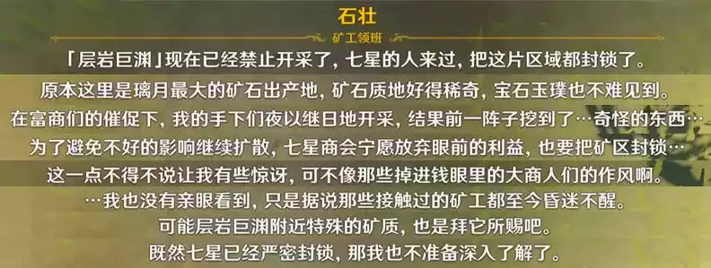 时间回到现在,近期黑岩厂因为层岩巨渊的变故而停止了开采活动,风筝摊边上的管事阿宽发布过世界任务黑岩之困,层岩巨渊附近的领班石壮也给出了相关的信息:挖出了某个奇怪的东西,接触到的矿工全部昏迷不醒。