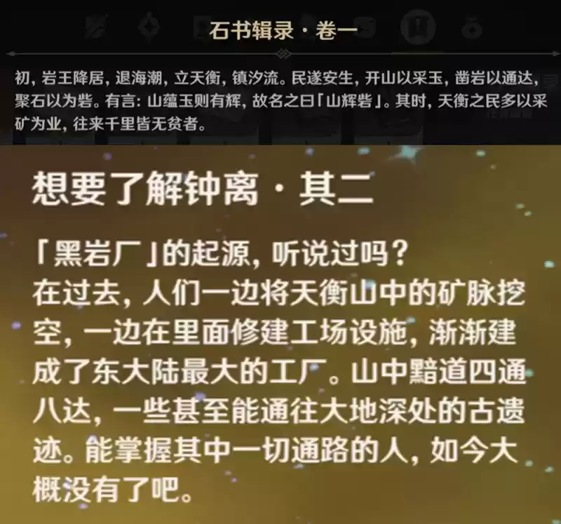 与之相似的还有璃月港倚靠的天衡山。根据《石书辑录》的记载,天衡山原本是岩神摩拉克斯用来阻断洪水的造物,本身丰富的矿产也让璃月港有了生活来源,山体内部还有东大陆最大的工厂——黑岩厂。