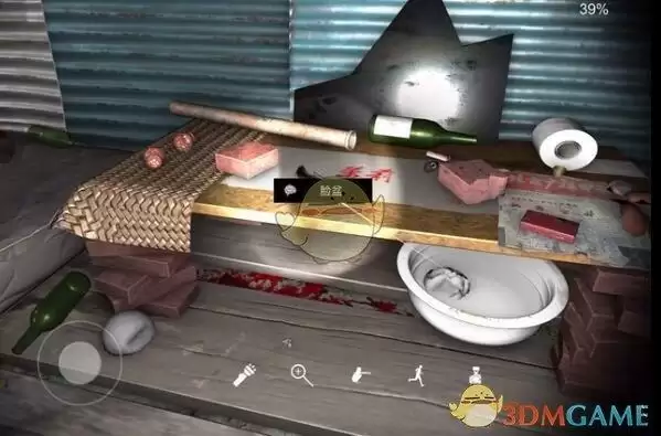 来到桌子的前面,稍微向后进行倒退,在如图所示的位置进行点击收集到“脸盆”这个线索。