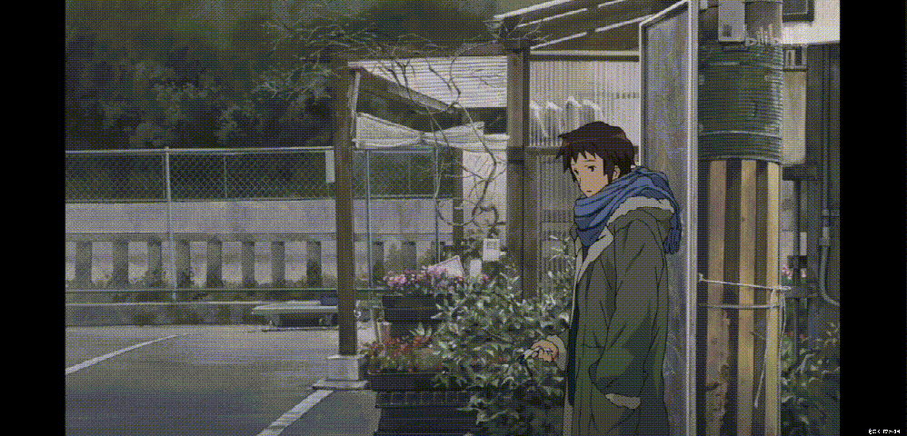 来到刚才提到过的那个侧面镜头,同时也是这段剧情的最后一个镜头——远景镜头下,阿虚与团长久久望着对方,随着阿虚内心独白的结束,一辆电车从后面呼啸而过。
