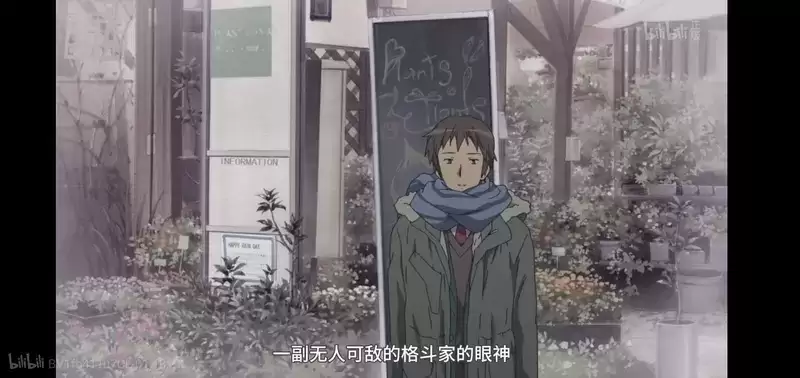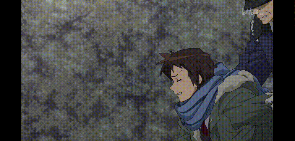 团长后脑大特写从右侧入画,环境的嘈杂与阿虚内心独白一同消失,取而代之的是空灵的bgm。镜头中时间的流动也随之慢了下来,团长就踏着舒缓的钢琴曲走在阿虚的心尖,前苏联著名导演普夫多金对慢镜头有个很美丽的描述——时间的特写,通过延长时间的方法,表现了阿虚再次见到团长时的美好情景。