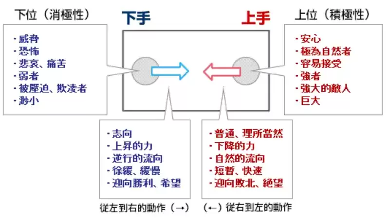 上下手示意图在日本动画中有这样一个约定俗成的习惯——“上下手”规律。