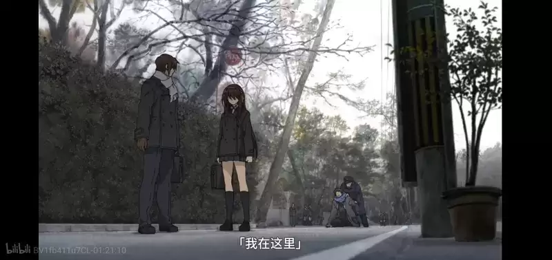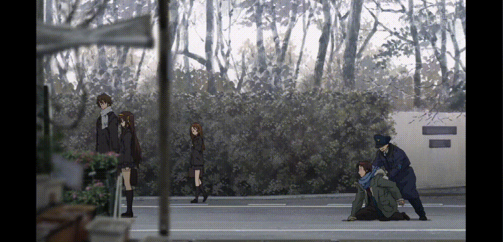 顺着阿虚的视线,团长和古泉越走越远,主观镜头用于代入阿虚的心情(其实我觉得这里加上镜头的小幅晃动和变焦效果会更好,更能体现阿虚的焦急,后面阿虚的表现会更加自然。)