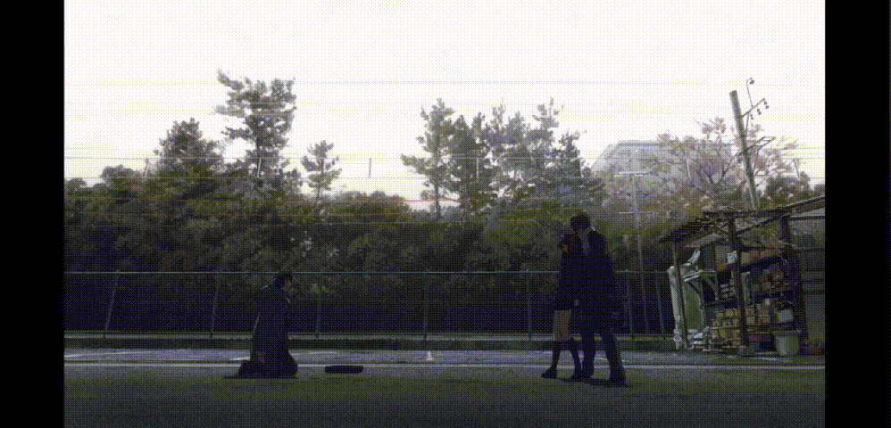 借助汽车的遮挡,镜头流畅地切换至阿虚的侧面镜头。同时,驶过的汽车强化了时间概念,暗示阿虚已经等待了很长时间。