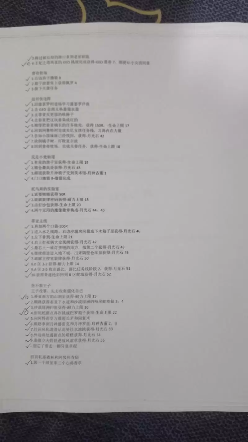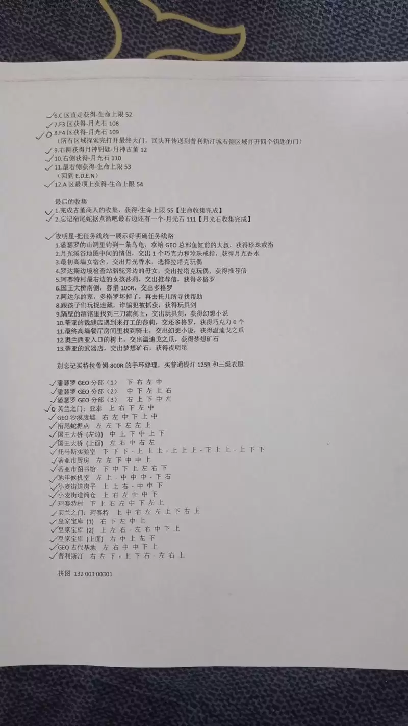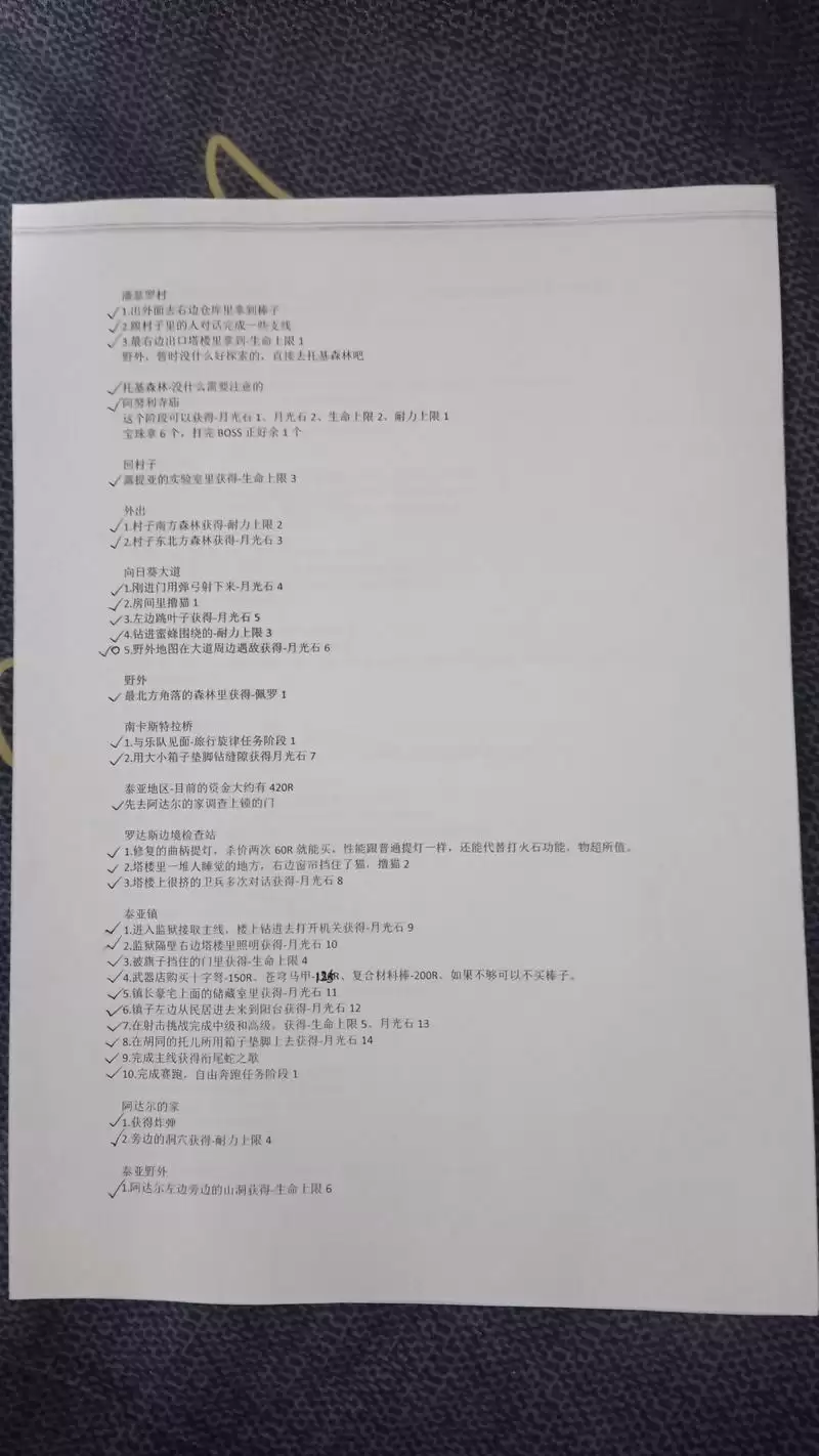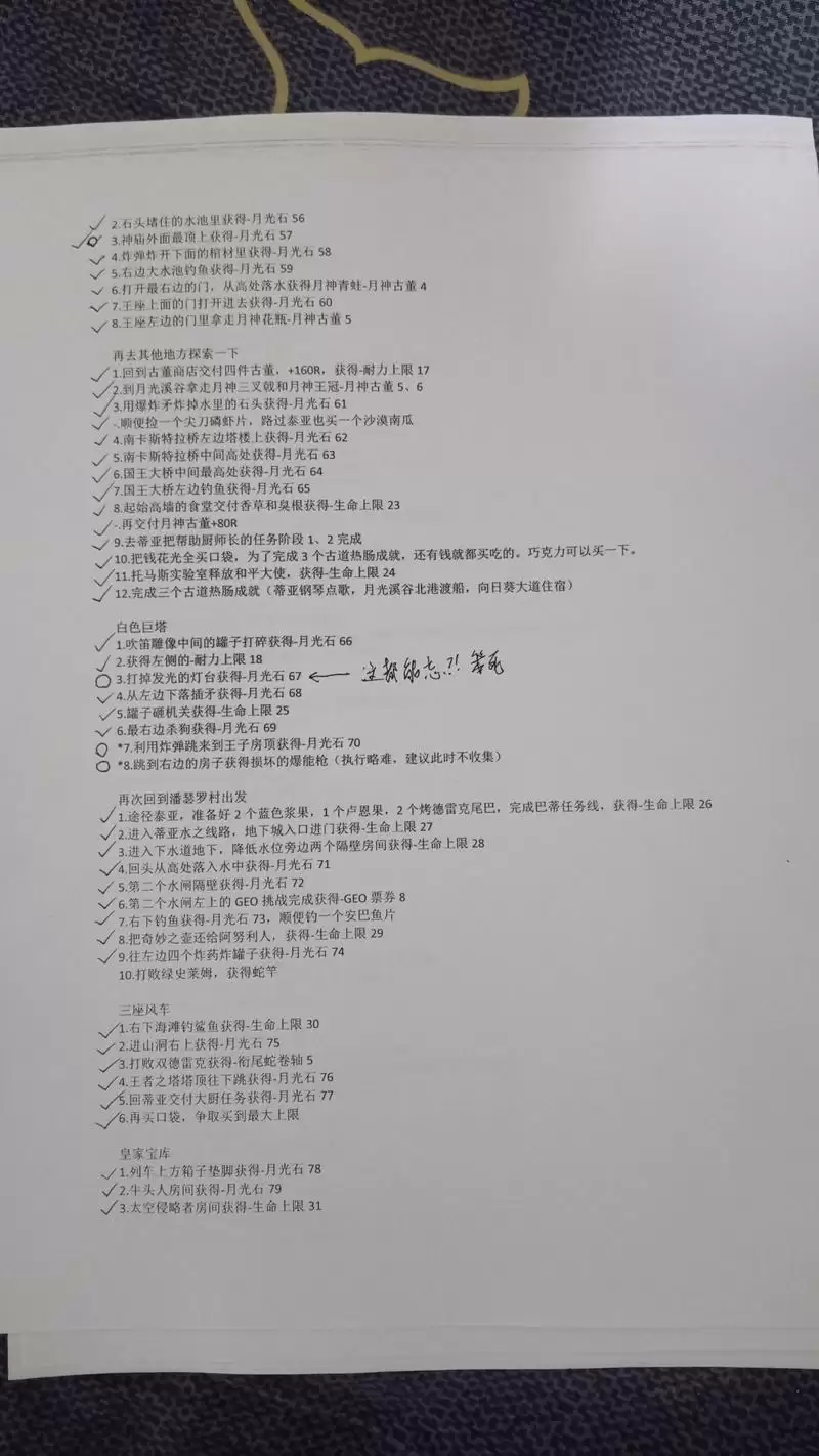 最后发几张无关紧要的东西,是我在录制的时候使用的纸质文件,虽然当做攻略指引来用应该绰绰有余了,不过这只是起一个辅助记忆的功能罢了。