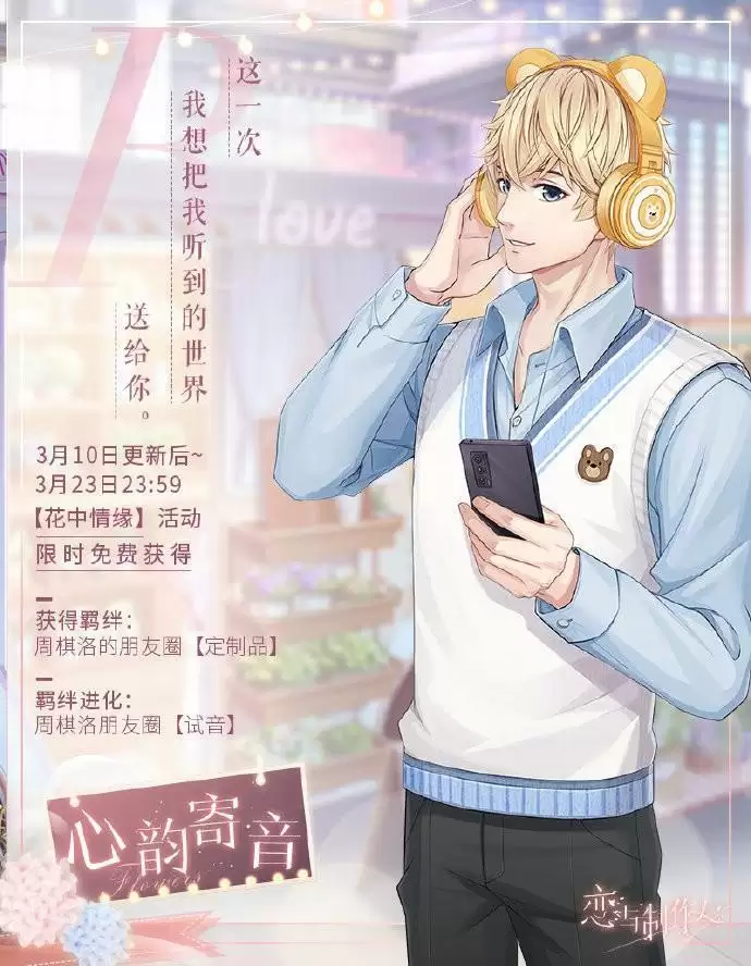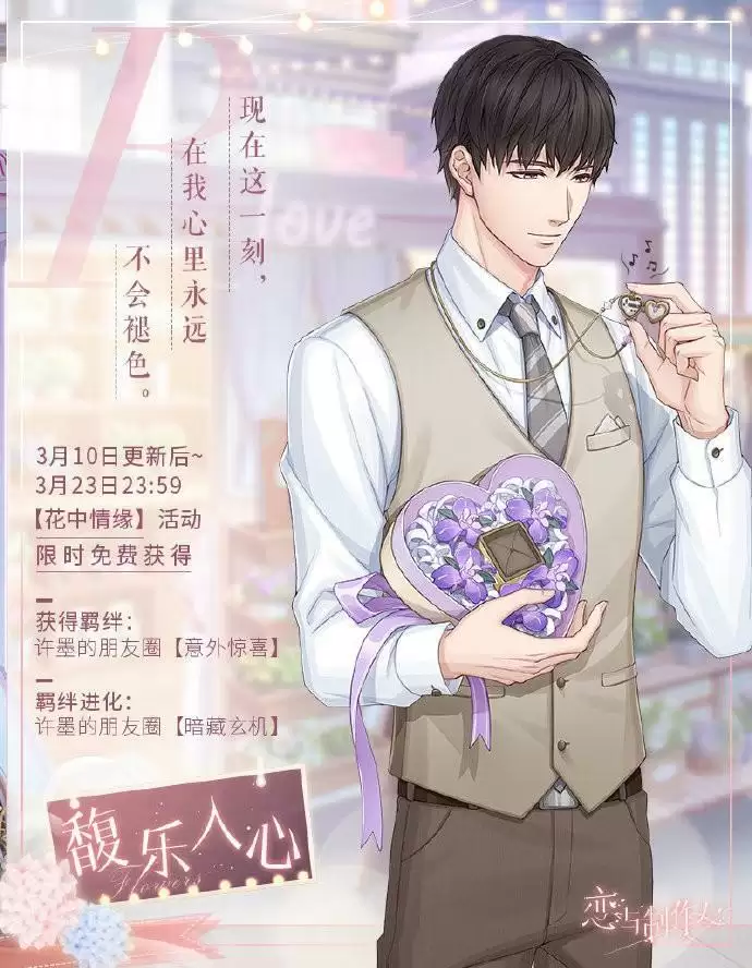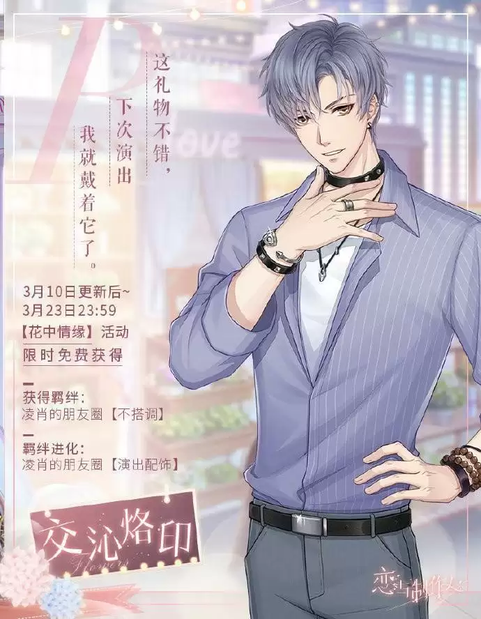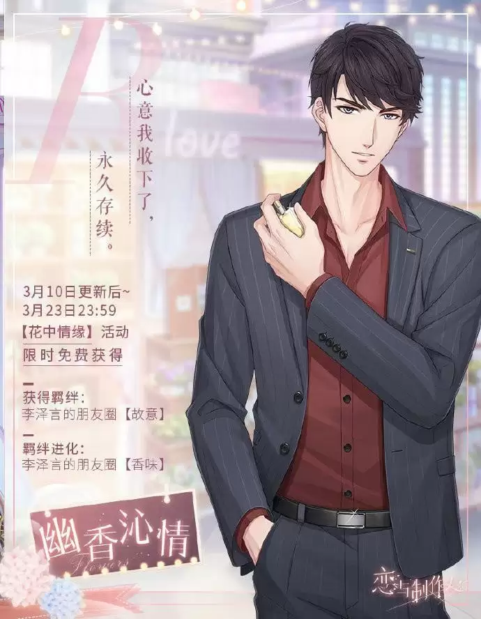 在恋与制作人手游中花中情缘活动有什么内容呢?纯白的恋人节日,赠予他藏在繁花与芬芳间的心意。本次活动会有免费的白色情人节羁绊可以获得,那么想知道花中情缘活动内容的就跟随小编一起来看看吧。