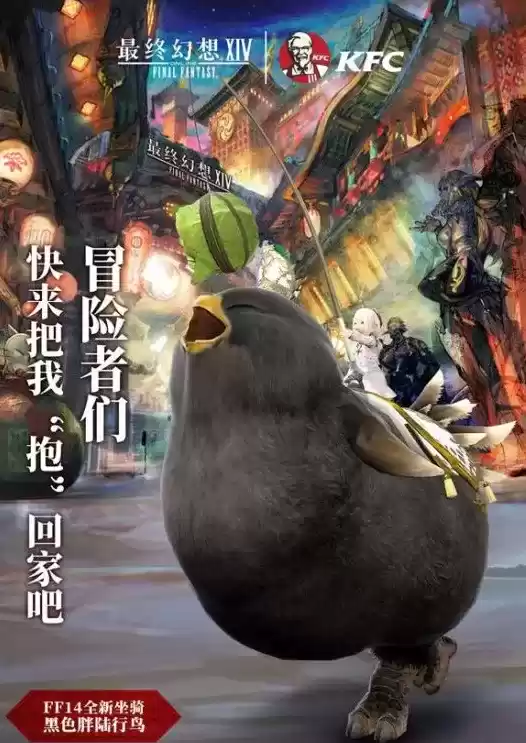 胖陆行鸟是FF14中非常有人气的坐骑比如SE旗下的网络游戏《最终幻想14》就曾联动KFC,推出了购买套餐赠送坐骑CDKEY的活动。可是这次活动是一个双人套餐对应一个CDKEY,要命的是这套餐的量非常大而且必须堂食,所以联动活动在当时催生了一大堆梗图。