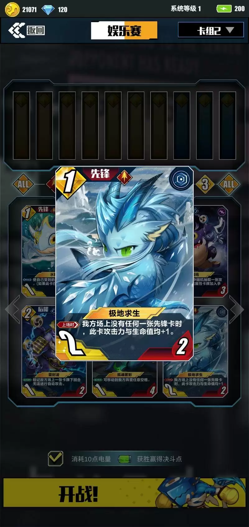 A:I.“极地求生”增益型先锋。上场时,若场上我方无前锋,可增加1攻1血。如果不是前期放的话,中期很难触发此技能。留到后期不确定因素太多,不好赢。