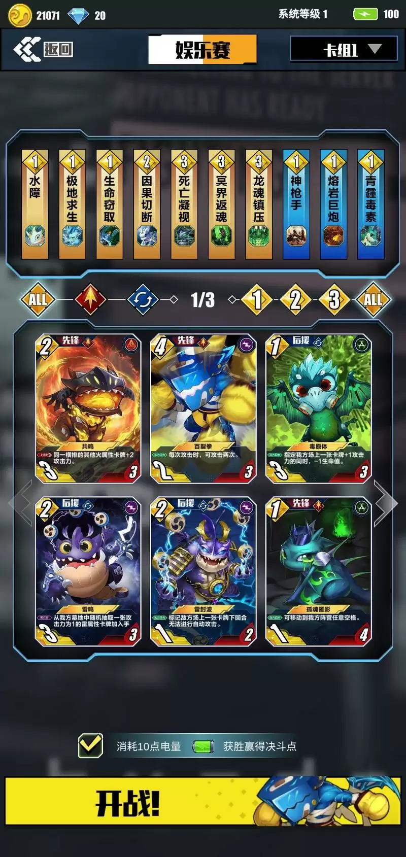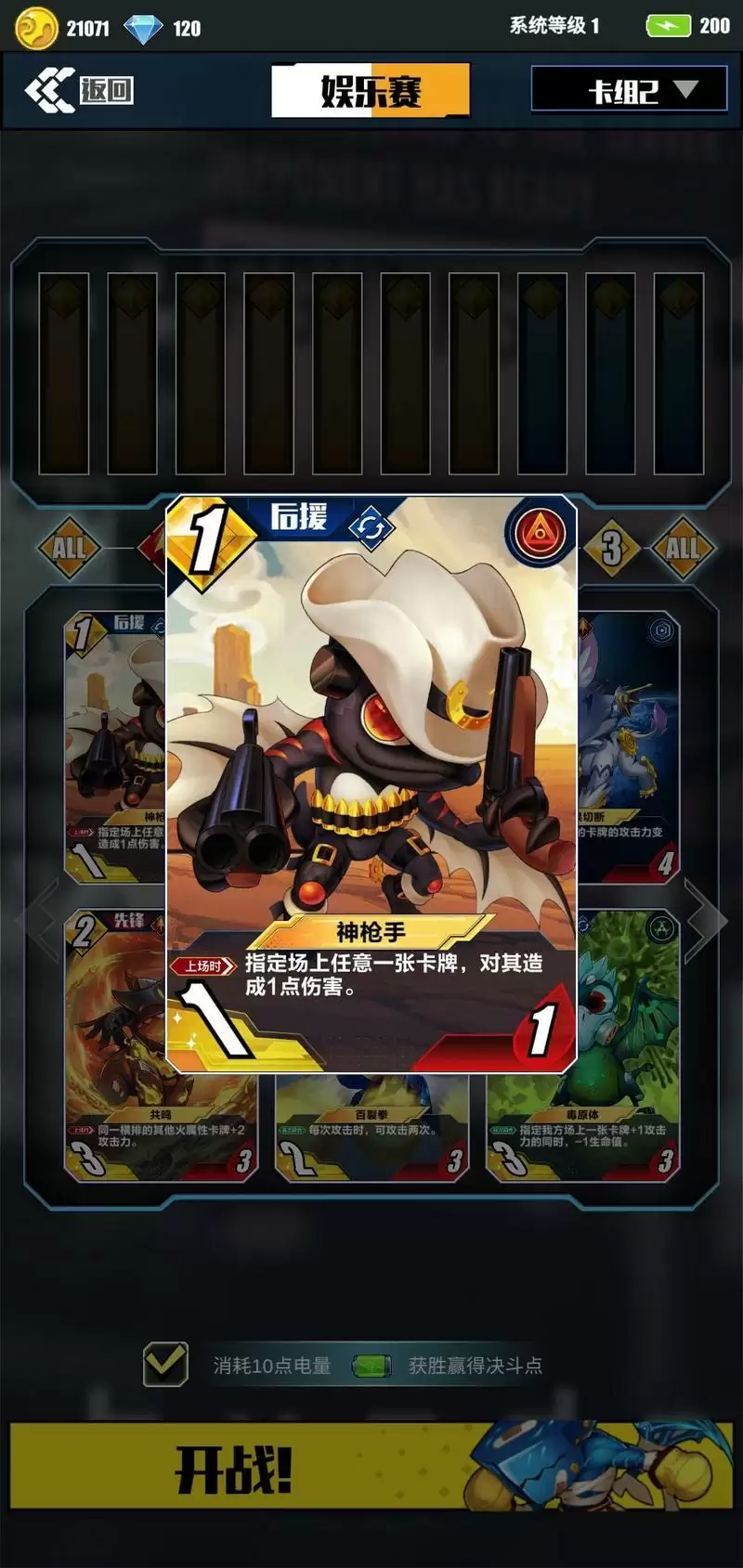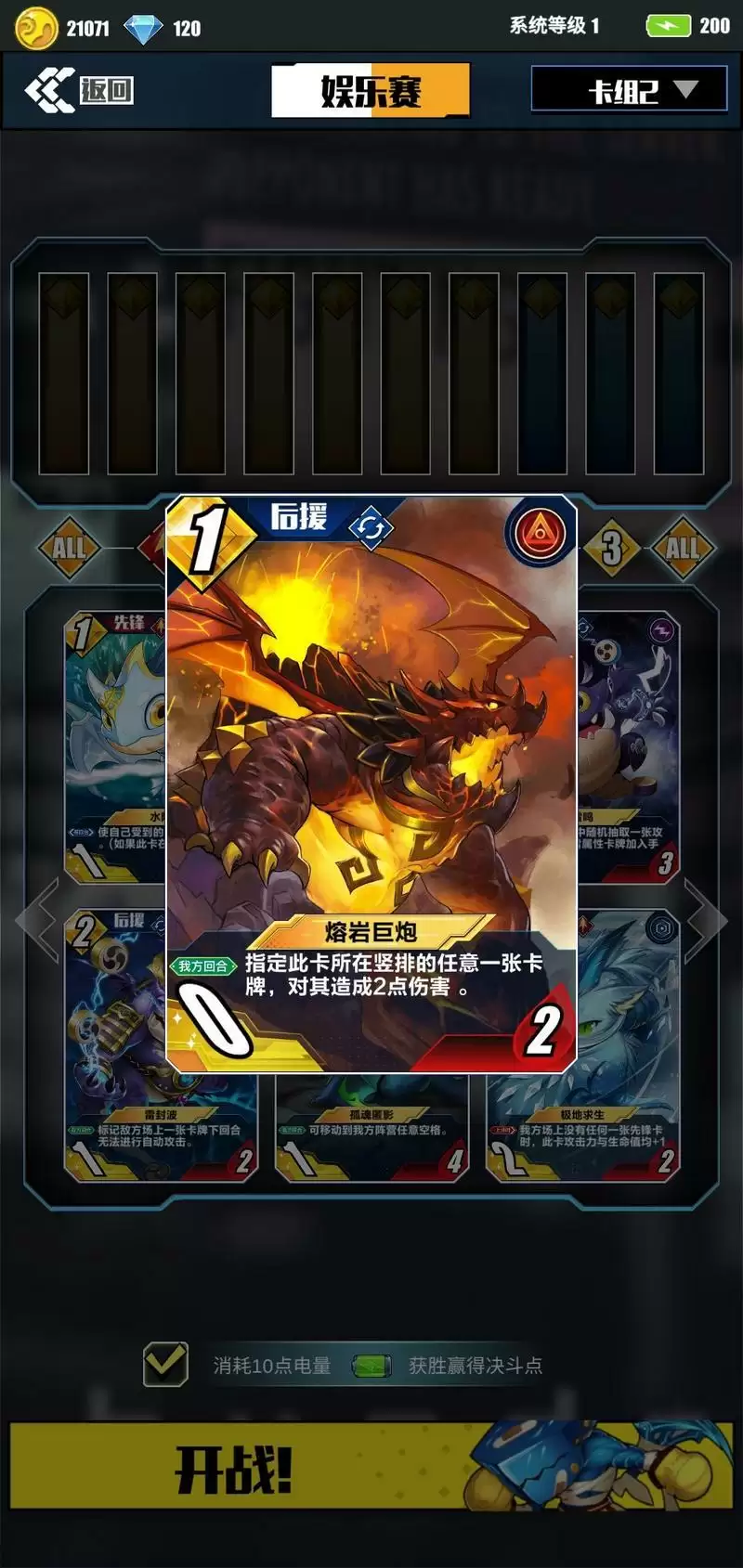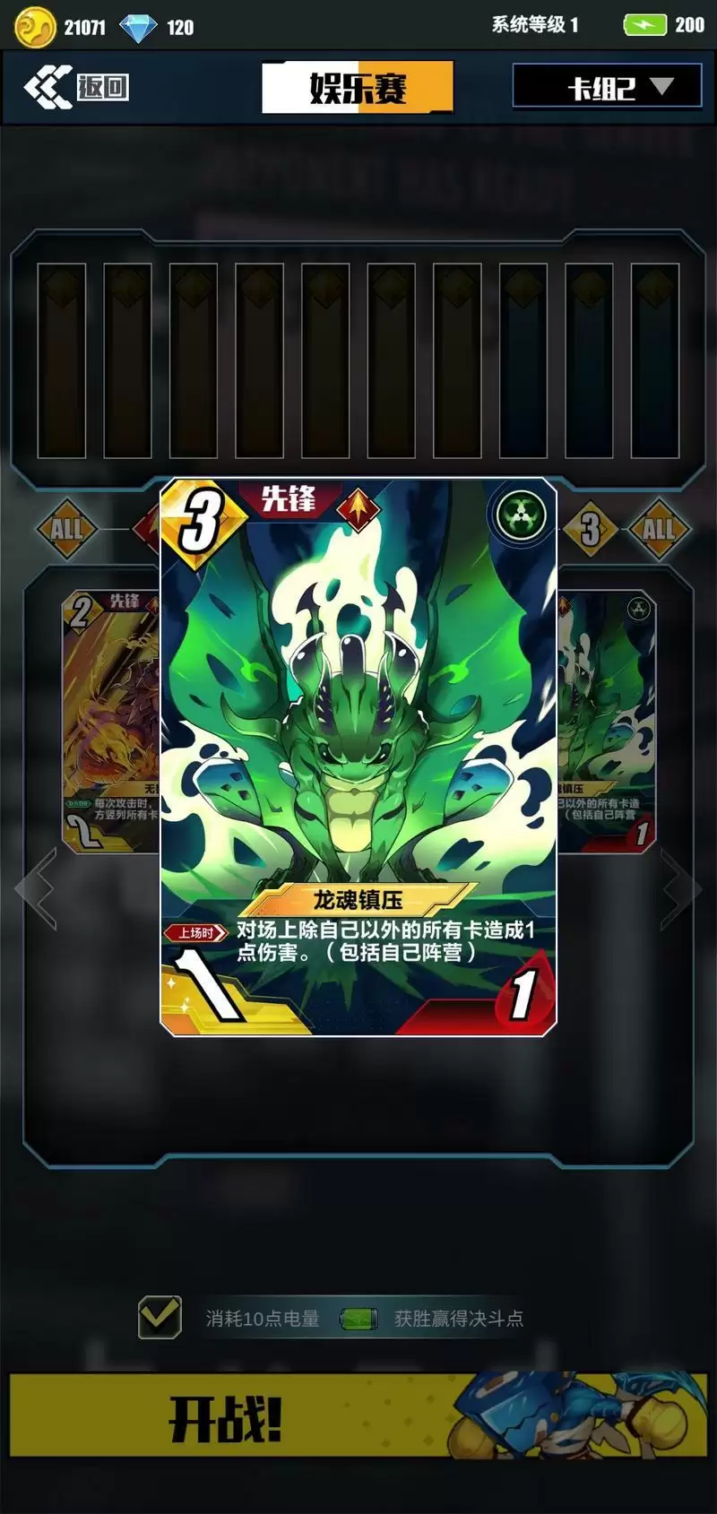 3.此卡一定要苟,苟到7-9回合就是我们的天下,神枪+火炮指哪打哪,举世无双。所以前中期以解卡为主。“龙魂镇压”和“狂热粉碎”可以相互替换,但使用“狂热粉碎”需要控敌方卡牌血量,操作难度略高,所以攻略推荐使用龙魂镇压。两张卡所达成的效果一样。
