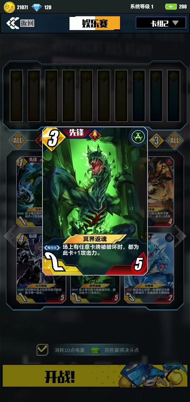 II.“冥界反魂”增益输出型先锋。因为此卡低费高属性(可通过技能叠加攻击力,生命值有5),可以说是万金油一样的卡牌,在任何时候任何情况下都可以使用。