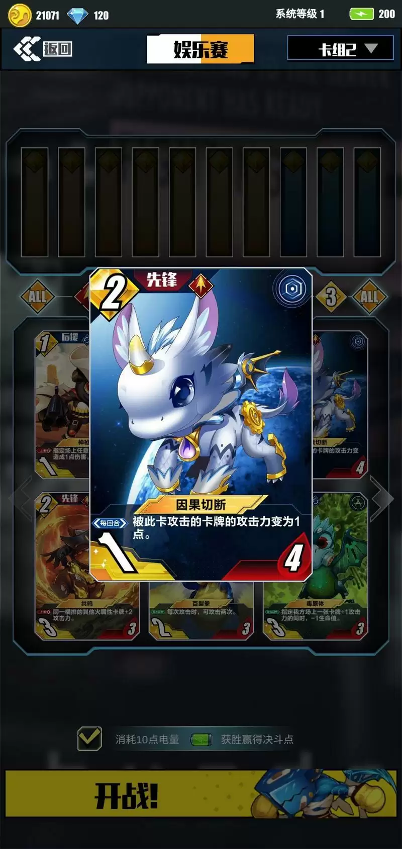 III.“因果切断”控制型先锋。此卡是为了克制像“冥界反魂”、“火狱帝皇”这种增益输出型先锋,所以推荐后手放克制对方卡牌。如果是先手放,就只能当做一张肉盾卡打,不推荐。