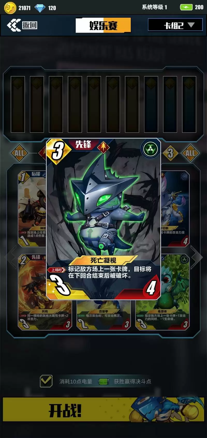 V.“龙魂镇压”、“死亡凝视”爆发型前锋,控制型前锋。一次性的技能需要在特定时机放出,时机不好不要放。(注:“死亡凝视” 不要标记后援,后援可以通过换卡操作刷新状态)