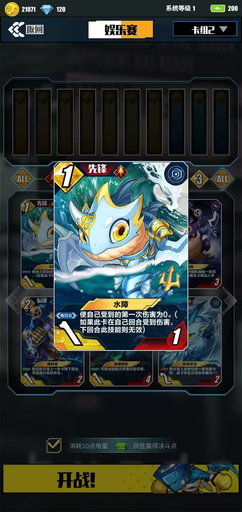 VI.“水障”控制型先锋。我个人认为是一张极其好的抗压牌,可以用于后期保护后排。但是其操作难度较高,对上场时机把控也比较难,玩不好就满盘皆输,所以优先级最低。