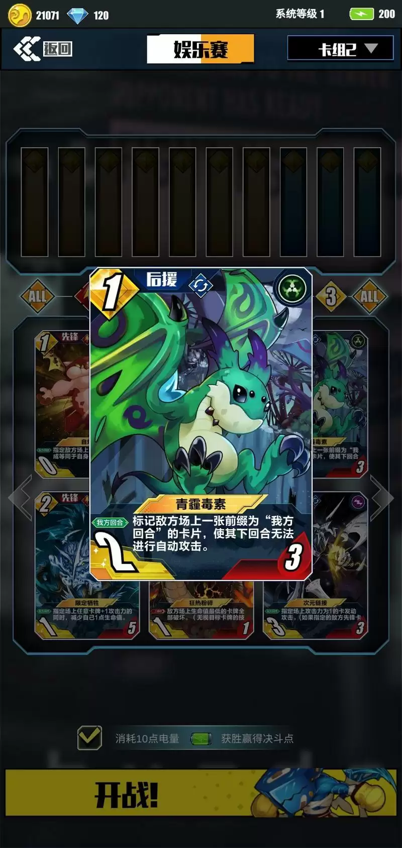 II.“青霾毒素”控制型后援,用于控对方先锋或后援输出。可以控制如“生命窃取”、“因果切断”等攻击力为1的卡牌。