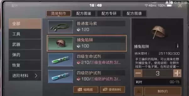 首先在配方里制作捕兔陷阱,然后在兔子洞口摆放。