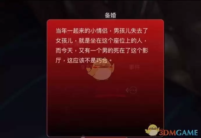 线索详情:当年一起来的小情侣,男孩儿失去了女孩儿,就是坐在这个座位上的人,而今天,又有一个男的死在了这个影厅,这应该不是巧合。