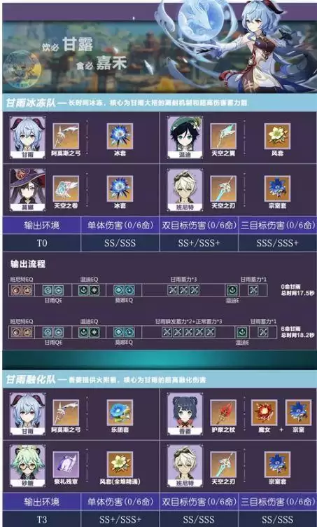 利用香菱EQ后台上火附着,甘雨站场蓄力射击,由于火打冰属于弱反应,甘雨的两段蓄力伤害都能触发融化。然后加上班尼特的加攻,砂糖的减抗和精通加成,甘雨本来就恐怖的蓄力箭伤害会成为核导弹。在这个队伍里,甘雨不放大招,大招会抢走蓄力箭的融化,得不偿失。因此甘雨在队友持续后台上火环境下持续打蓄力融化,由于不放大招对群伤害稍低于冰冻队,但由于有更多时间打蓄力箭对单伤害很高。满命甘雨可以在循环中插入更多吃到队友加成的蓄力箭,伤害极其夸张。输出环境上,由于没有冰冻队的控制,甘雨在面对多动的敌人时会丢失一定伤害。