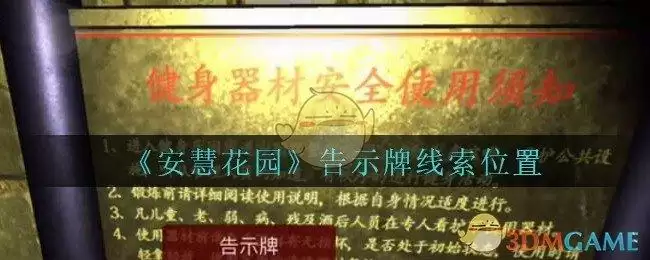 《安慧花园》是由孙美琪疑案开发团队开发制作的趣味解谜推理类游戏,本案我们将来到一个健身小花园,在这里我们遇到的五级线索——告示牌在哪里呢?下面是3DM手游网小编给大家带来的《孙美琪疑案:安慧花园》告示牌线索位置介绍,还未找到的小伙伴一起看看吧!