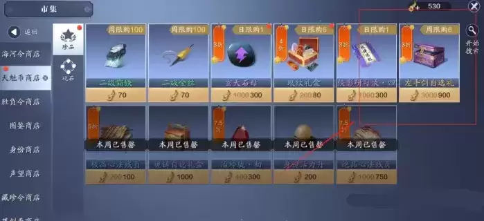 1)天魁币兑换:单手剑的质料获取比较特别,可以通过天魁币进行兑换,每个900天魁币,每周可兑换10个。所以大家这周开始赶紧多存点天魁币。
