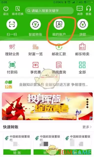 1、登录邮政银行手机页面,点击“我的账户”,如果自己有几个签约账户,那你就选择其中一个作为想定期的账户。