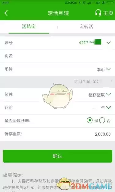 3、定活互转有活期转定期与定期转活期这两种。如果想活期转为定期,那选择填写储种,存期金额等后确认,输入交易密码就可以了。如果你有定期到期了,那你就可以选择定转活,同样根据它的提示操作就可以了。