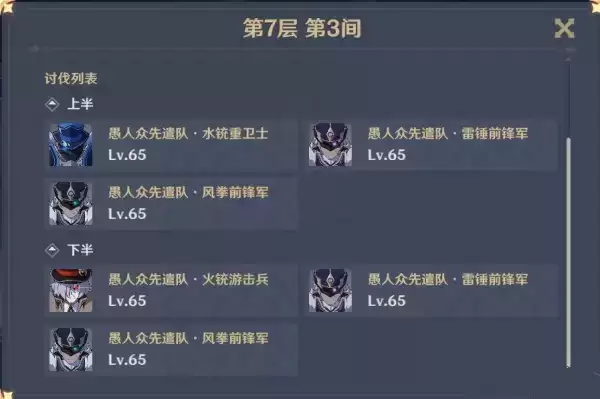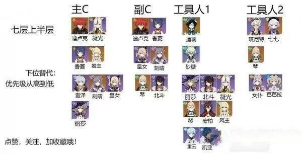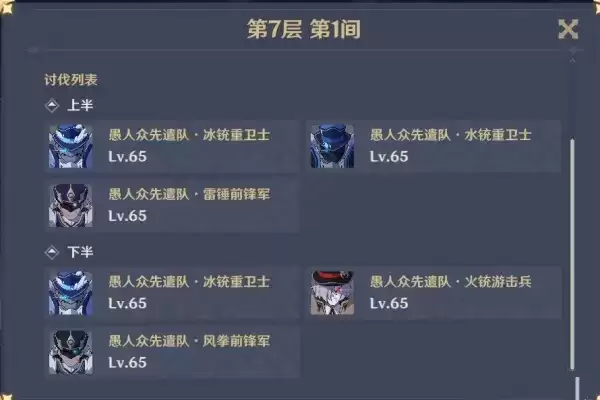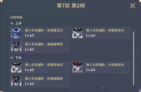 第7层刚打到的兄弟们,几乎会比较崩溃,就不要给这种怪爆发元素的机会,不然下面那厚厚的护盾,有你感受的,不用对应克制的元素打的话,慢的一批,建议再开始的时候直接爆发击杀,辅助最好都是给队伍加元素能量的圣遗物套装,让主C和副C能快速的爆发,不然,能过,但不会满星,很难受就是了,还有可能出现暴毙的情况.