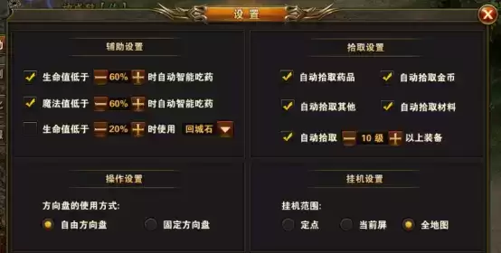在挂机设置界面当中,你可以对自动吃药等进行设置。