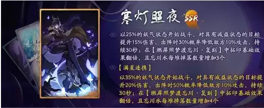 以35%的妖气状态开始战斗,对具有减益状态的目标提升20%伤害,出阵时30%概率降低敌方10%攻击,持续30秒。